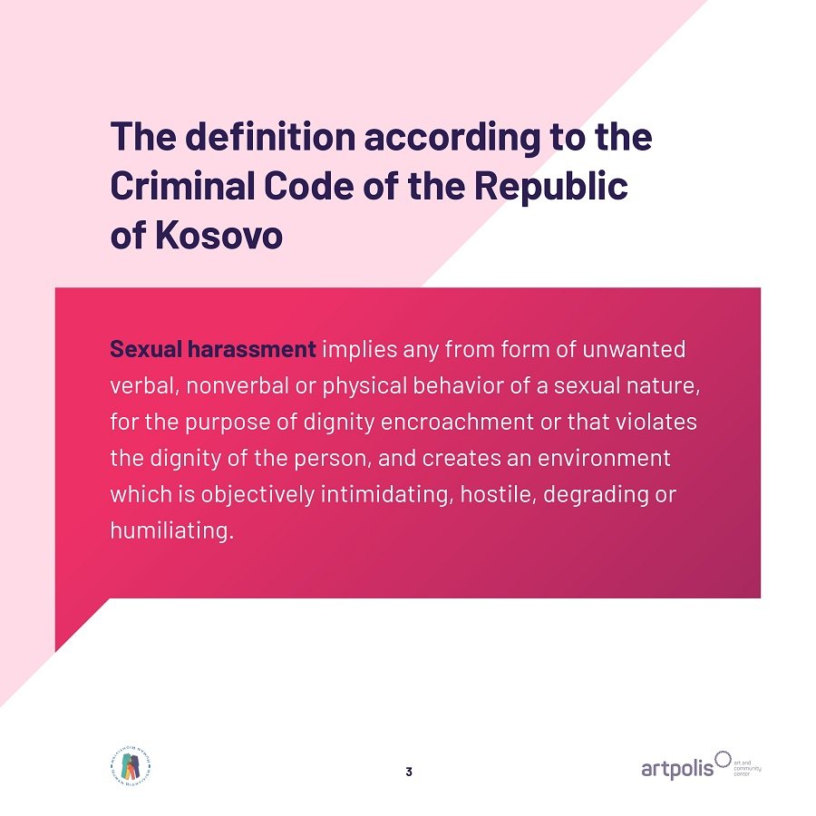 Based on the Criminal Code of the Republic of Kosovo ‘Sexual harassment’ shall mean any form of unwanted verbal, non-verbal or physical conduct of a sexual nature which aims at or effectively constitutes a violation of the dignity of a person, which creates an intimidating, hostile, degrading or offensive environment.