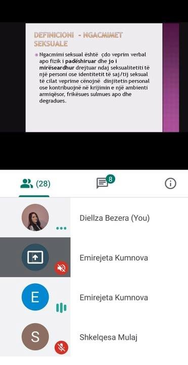 Emirëjeta Kumnova discussed on these topics: Sexual Harassment – Definition, Identification of Harassing Behaviors; Behaviors that may constitute sexual harassment; Psychological consequences of sexual harassment; Sexual harassment within Public Universities; Challenges in reporting and addressing them.